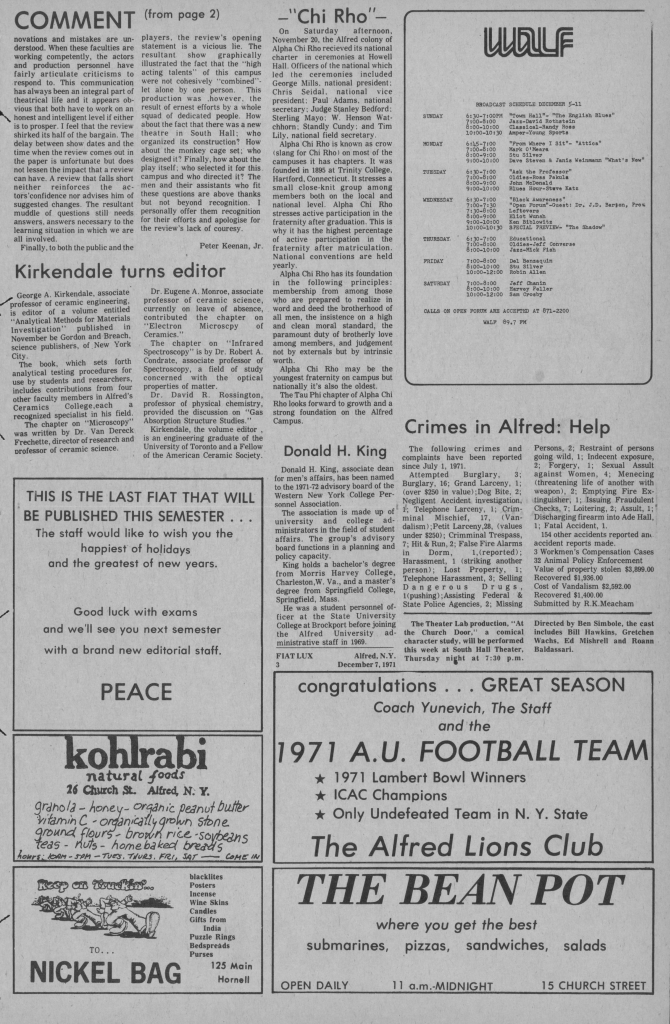 Below is page 3 of the December 7, 1971 Fiat Lux Campus Newspaper. An article titled “Chi Rho” announces the chartering of the newest chapter of Alpha Chi Rho. You can also read about the chartering in the Winter 1972 Garnet & White here.